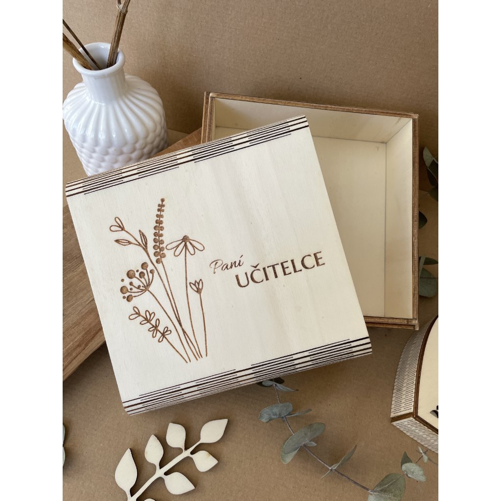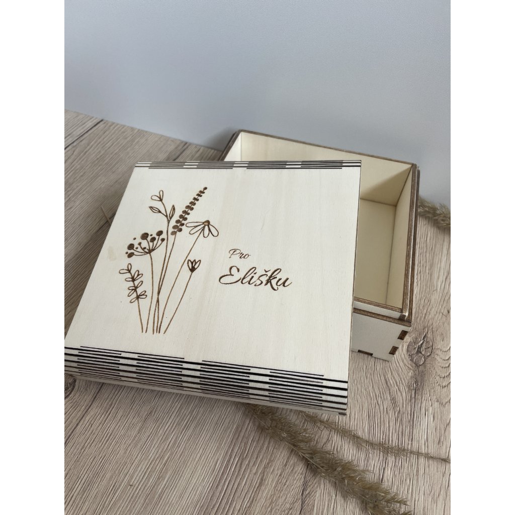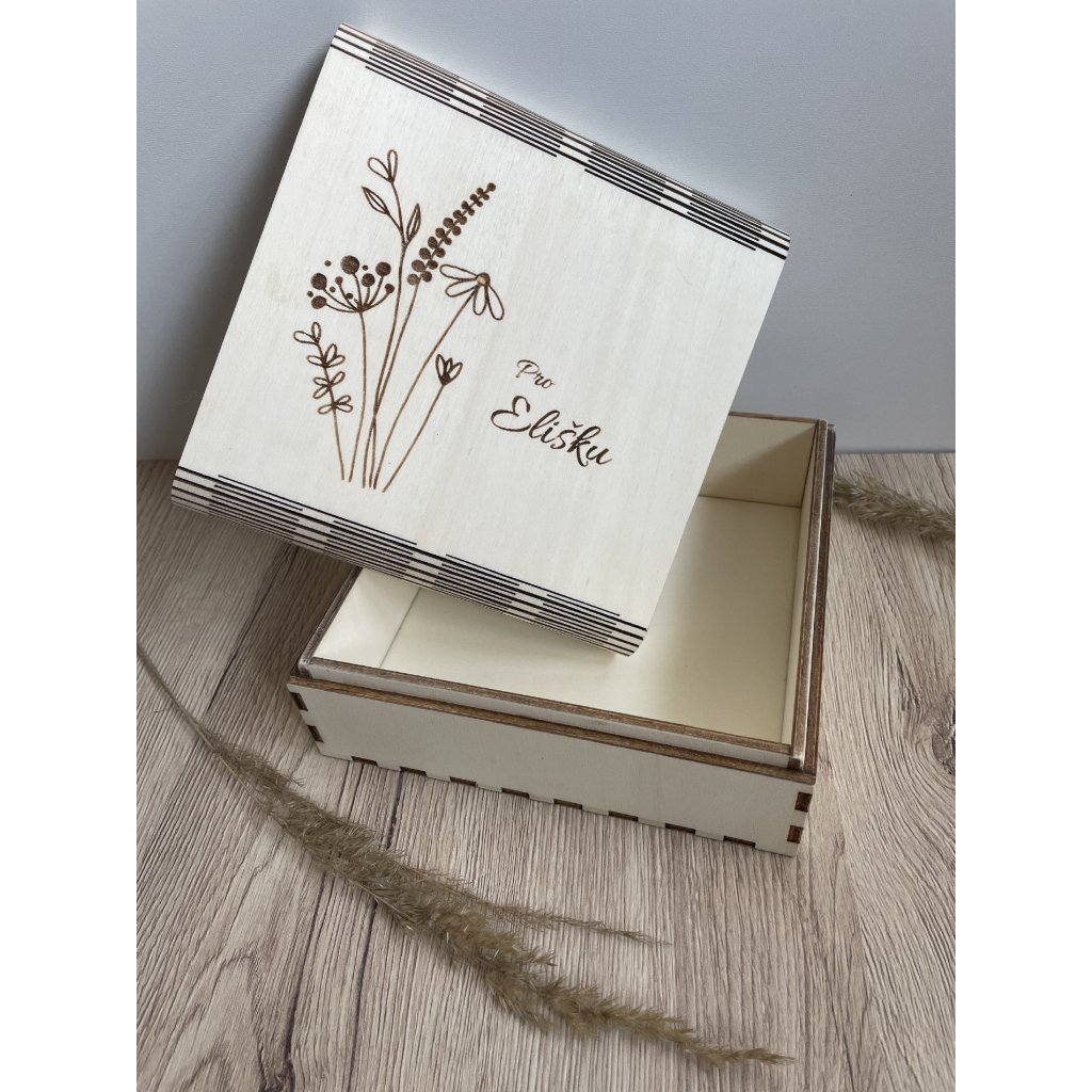 Dřevěná krabička s jemným motivem lučního kvítí na víčku je krásné balení pro dárek nebo místo pro milé vzpomínky. Díky rozměrům 17 × 17 × 7 cm nabízí dostatek prostoru na drobnosti, ručně psané vzkazy, šperky, sladkosti, fotografie, bankovky či symbolické předměty.