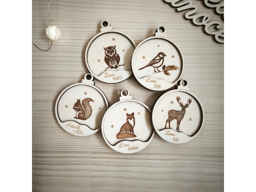 Nápis Zimní klid dodává celé ozdobě jemnost a působí harmonicky v kombinaci s ostatními motivy z kolekce Zvířátka z lesa.