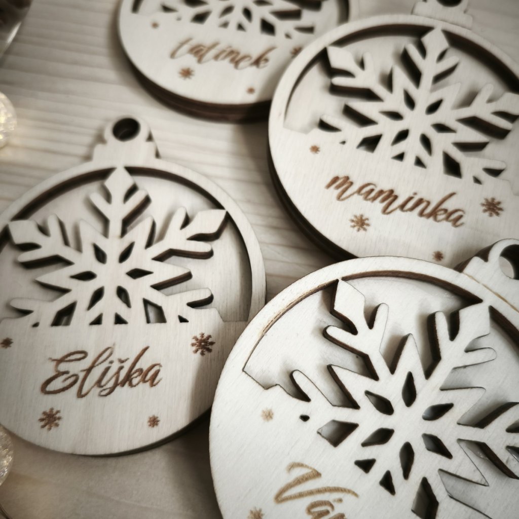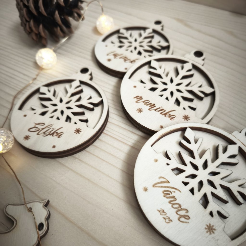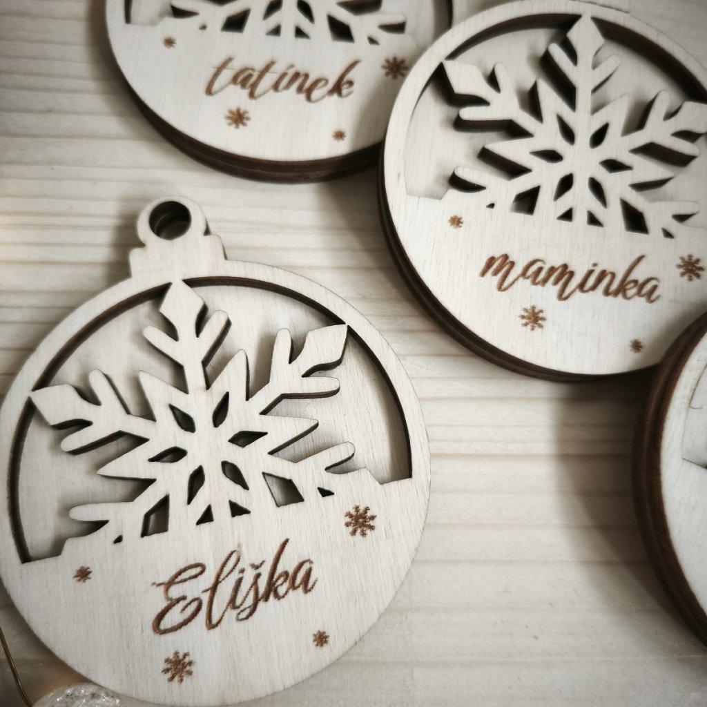 Dřevěná baňka má uvnitř vyřezanou velkou vločku, která působí elegantně a čistě. Na přední část vám vygravírujeme jméno – díky tomu se baňka stane osobním doplňkem na stromeček nebo milým detailem u dárku.