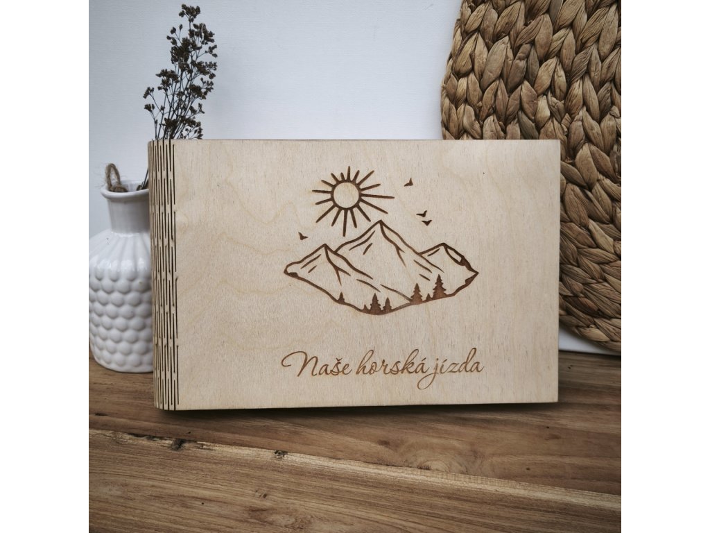 Přední desku zdobí jemný motiv hor a nápis podle vašeho přání – může to být jméno, datum nebo krátký text.