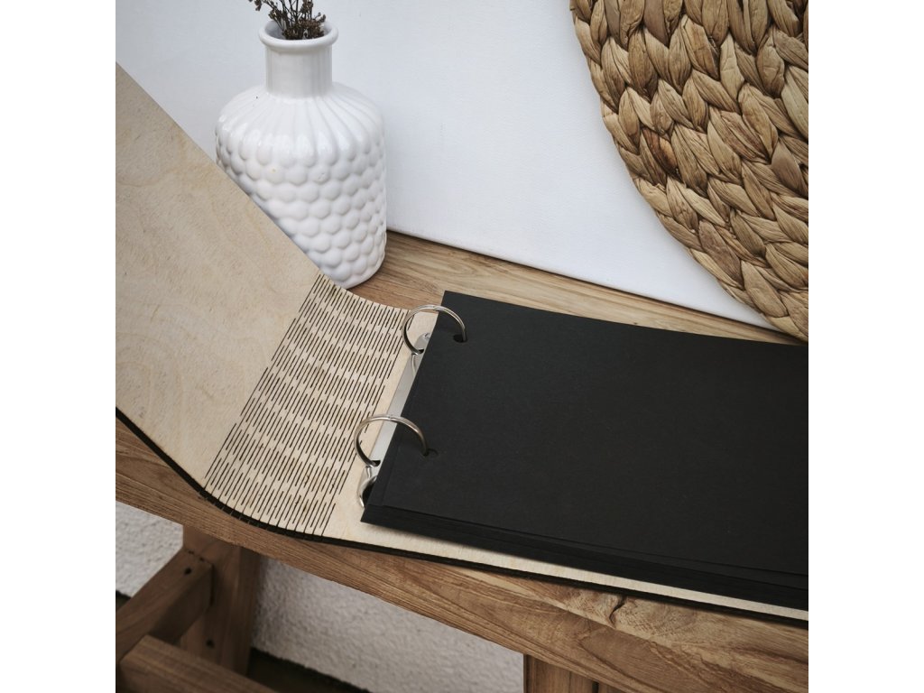 Obal alba je z jednoho kusu ohýbané 4 mm březové překližky, vazba je kroužková. Uvnitř najdete 25 černých listů o gramáži 225g, vhodných na fotografie, vzkazy nebo svatební přání od hostů.