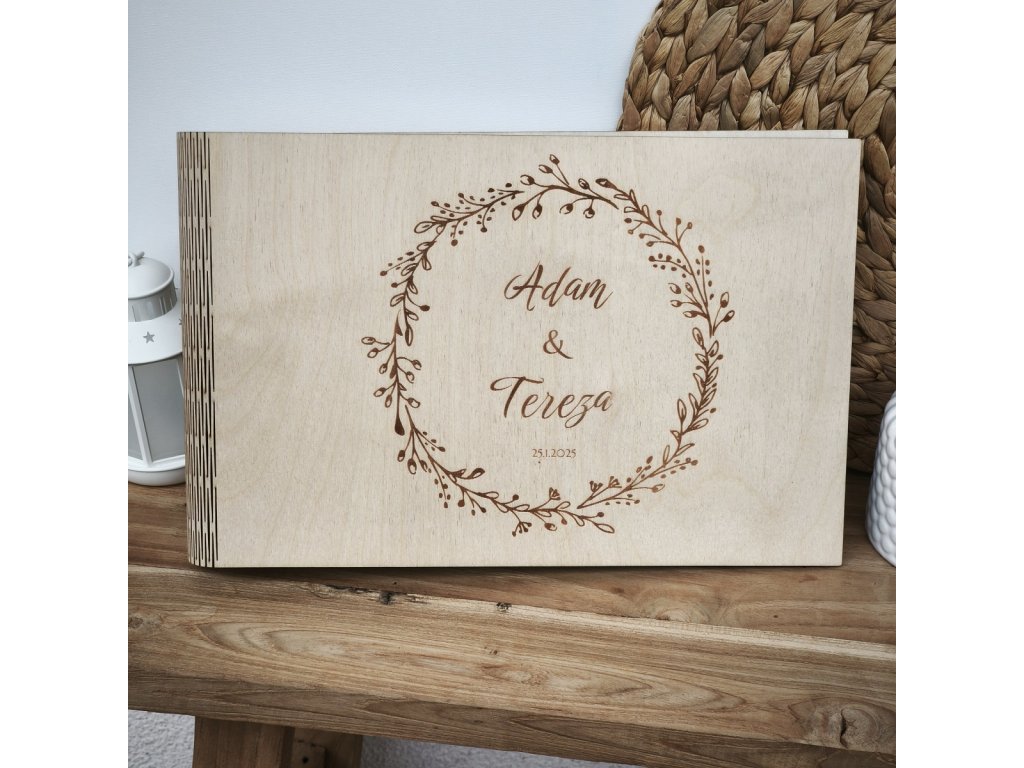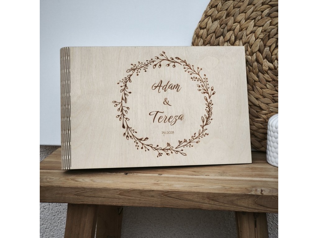 Dřevěné svatební album s jemným květinovým věncem vygravírovaným na přední desce. Uvnitř věnce gravírujeme jména novomanželů a datum svatby - vzniká tak osobní a krásná vzpomínka na výjímečný den.
