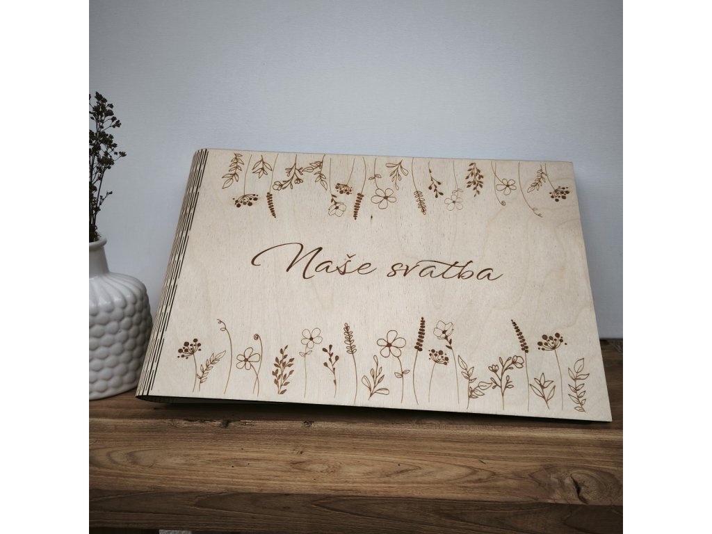 Dřevěné svatební album s jemným motivem lučních květů vygravírovaných na přední desce. Doplníme jména novomanželů a datum svatby – vznikne tak osobní a krásná vzpomínka na výjimečný den.