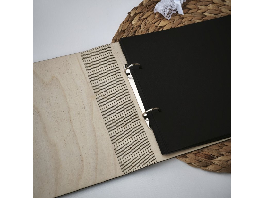 Obal alba je z jednoho kusu ohýbané 4 mm březové překližky, vazba je kroužková. Uvnitř najdete 25 černých listů o gramáži 225g, vhodných na fotografie, vzkazy nebo svatební přání od hostů.