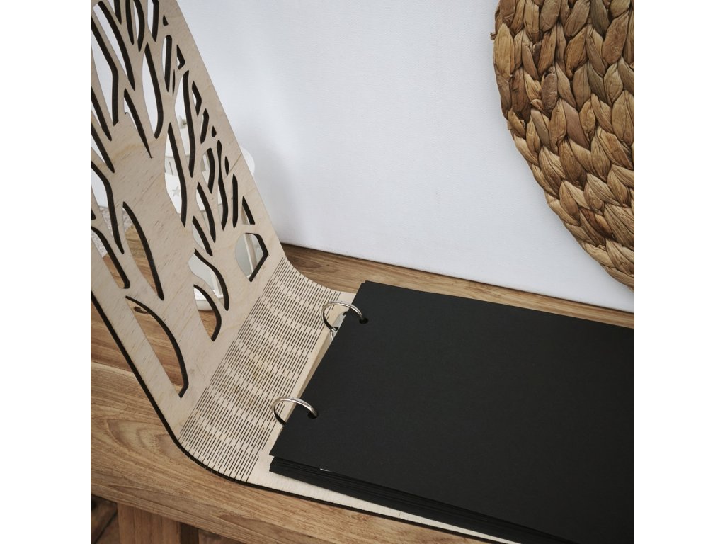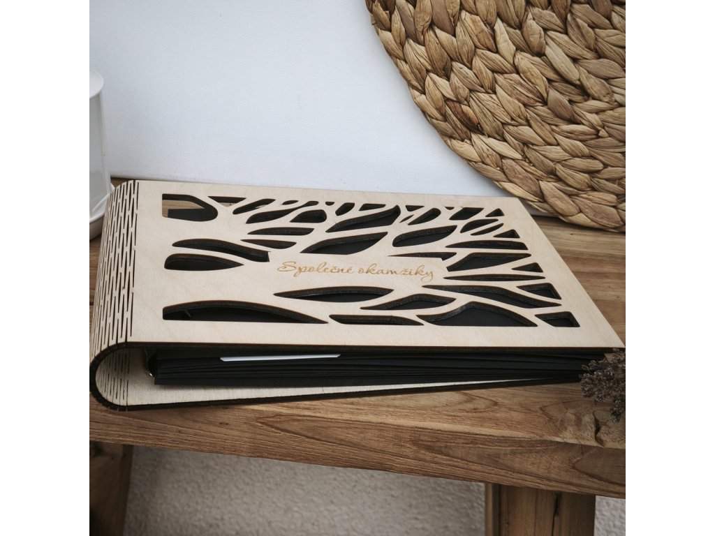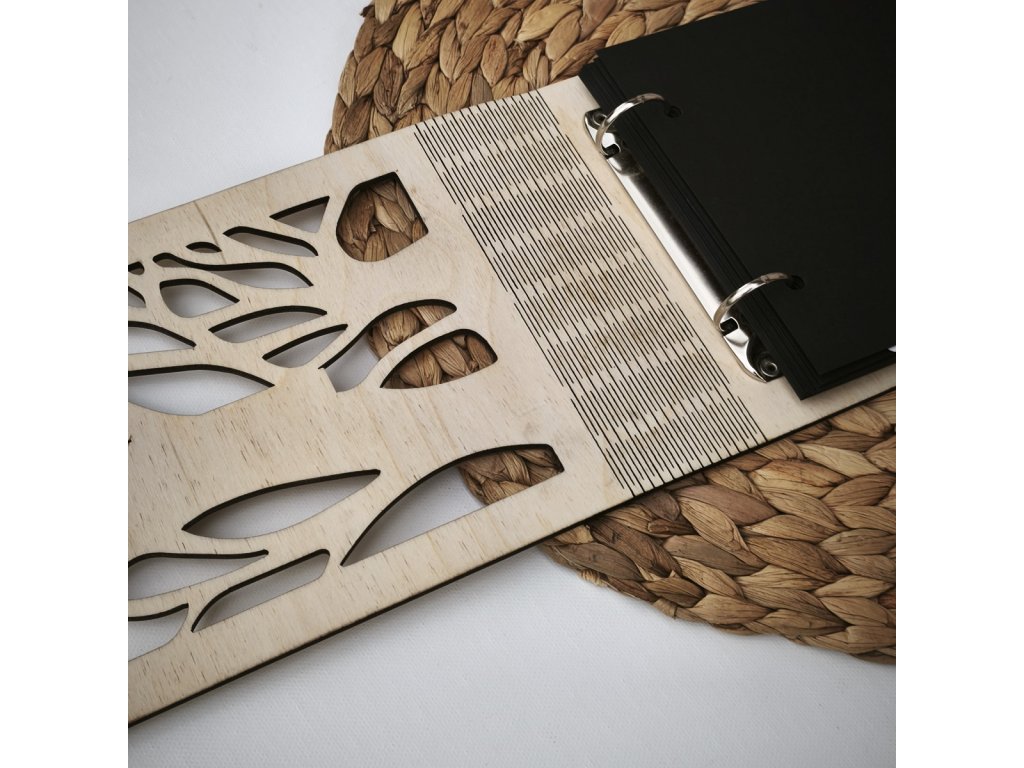 Obal alba je z jednoho kusu ohýbané 4 mm březové překližky, vazba je kroužková. Uvnitř najdete 25 černých listů o gramáži 225g, vhodných na fotografie, vzkazy nebo svatební přání od hostů.