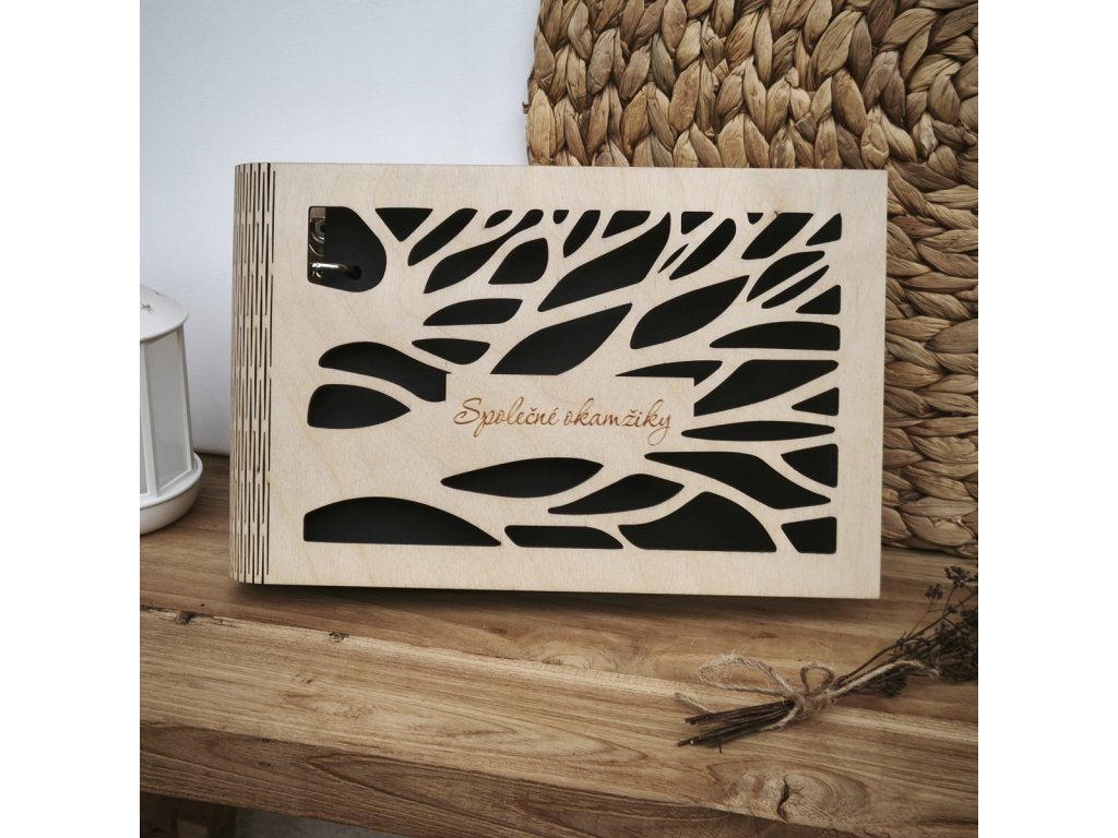 Přední desku zdobí jemný motiv větví a nápis podle vašeho přání – může to být jméno, datum nebo krátký text.