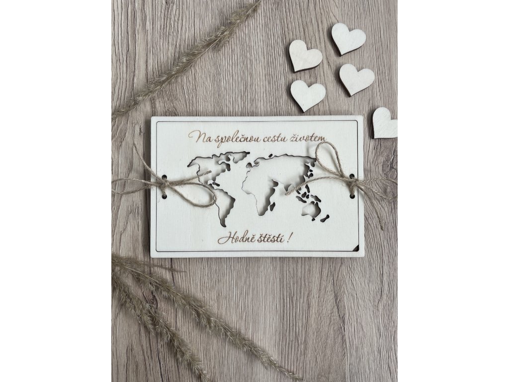 Dřevěné přání na peníze - Novomanželům MAPA SVĚTA