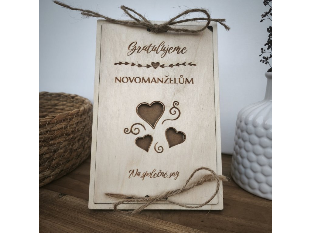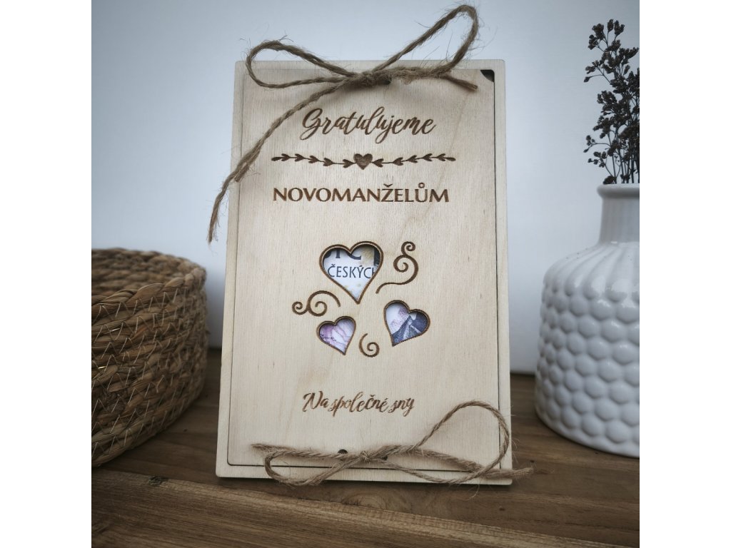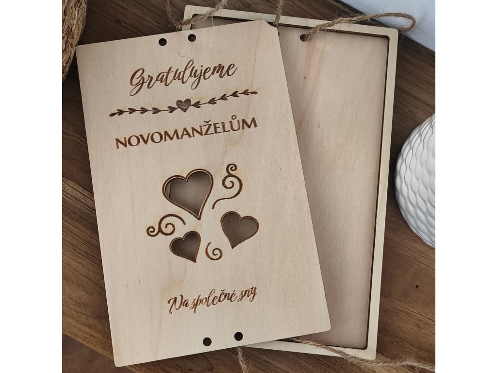 Bankovka nebo vzkaz se vloží dovnitř a zaváže přiloženým jutovým provázkem. Otevřený výřez prozradí, co se schovává uvnitř.