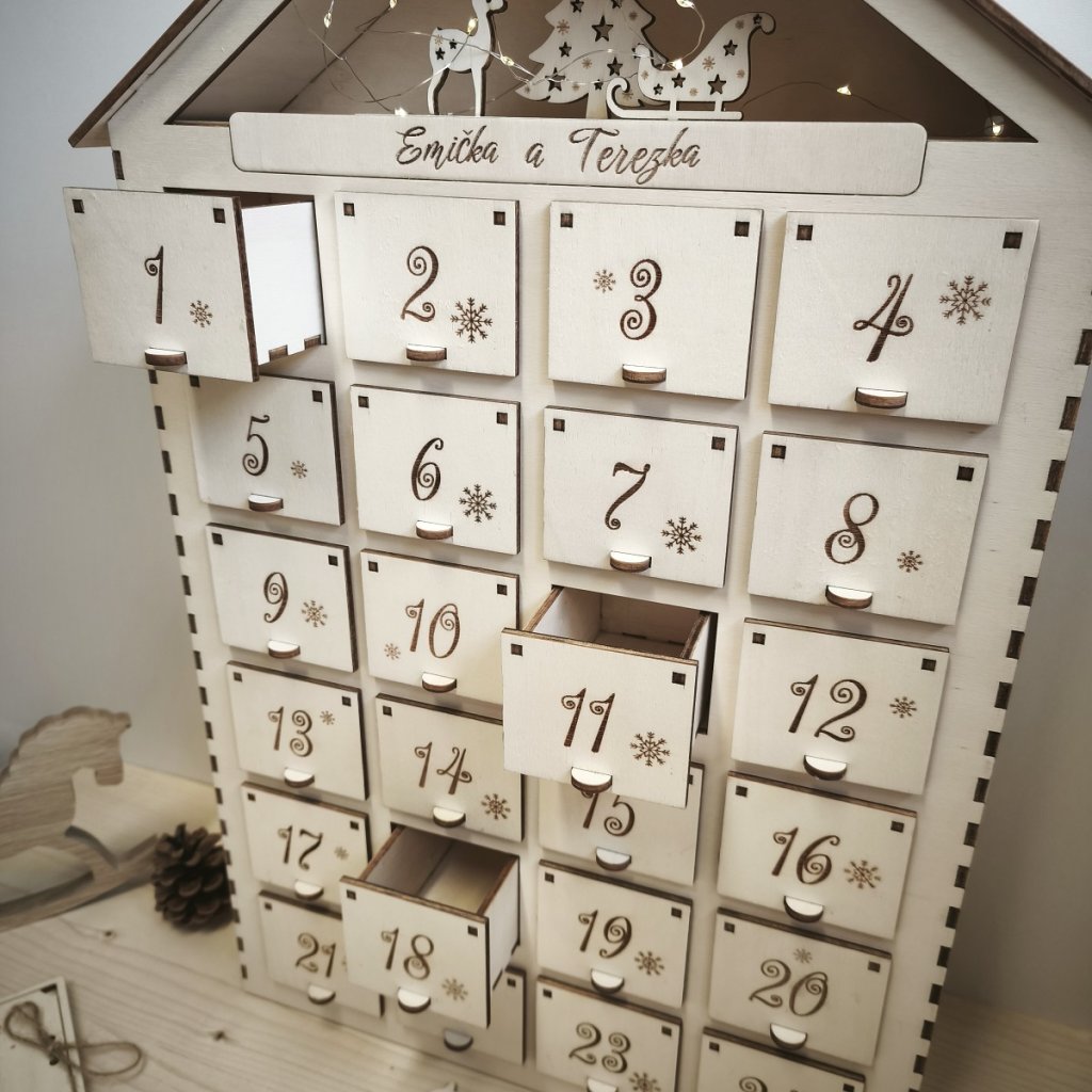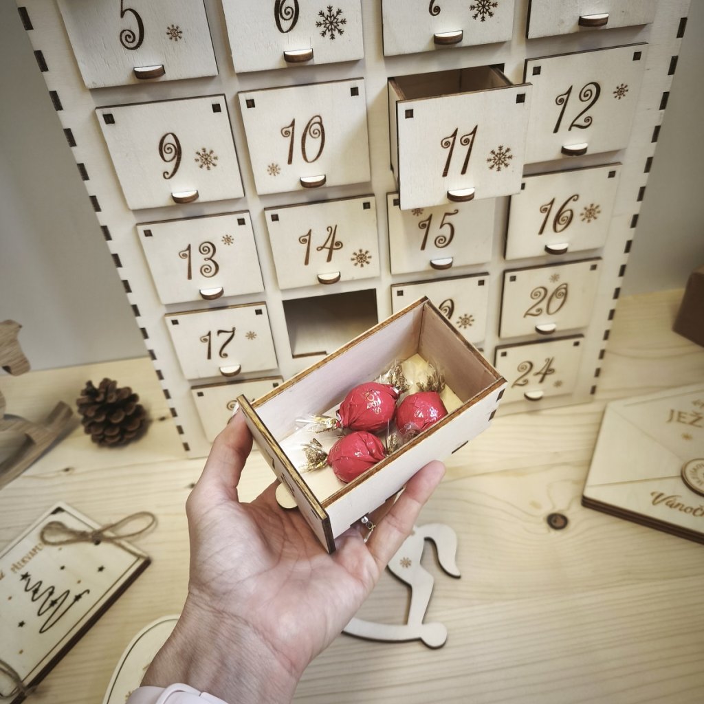 Do každého šuplíčku můžete vložit drobný dárek, vzkaz nebo sladkost – podle toho, co udělá radost právě u vás doma.