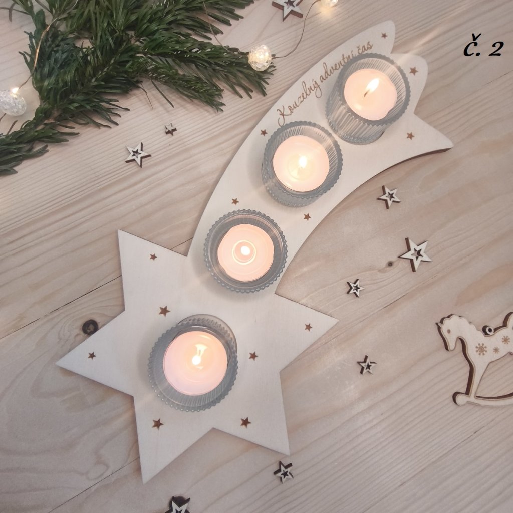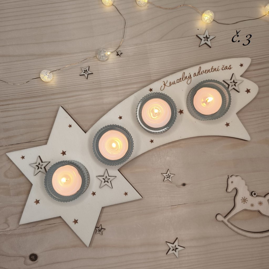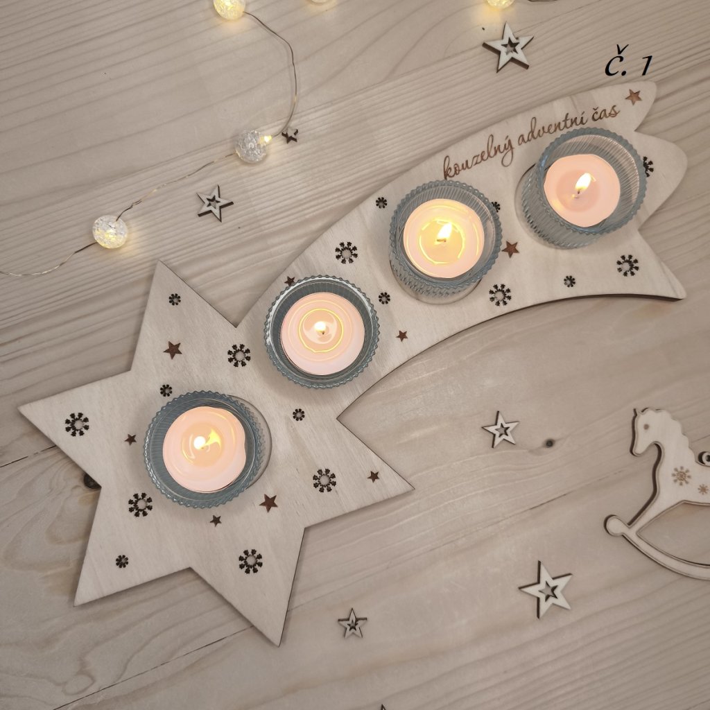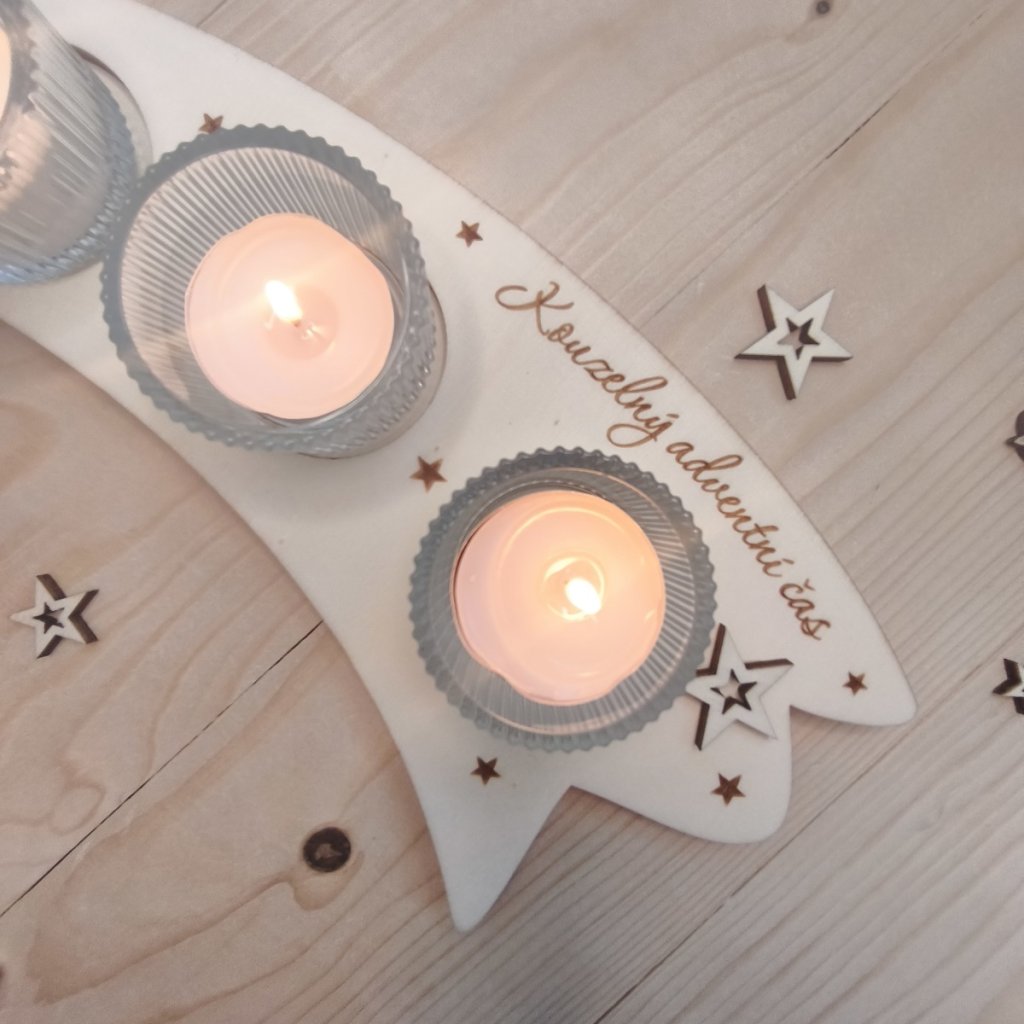 Dřevěný adventní svícen ve tvaru komety je jemná dekorace, která zpříjemní prosincové večery. Je určený na čtyři skleničky pro čajové svíčky – každá z nich symbolizuje jeden adventní týden.