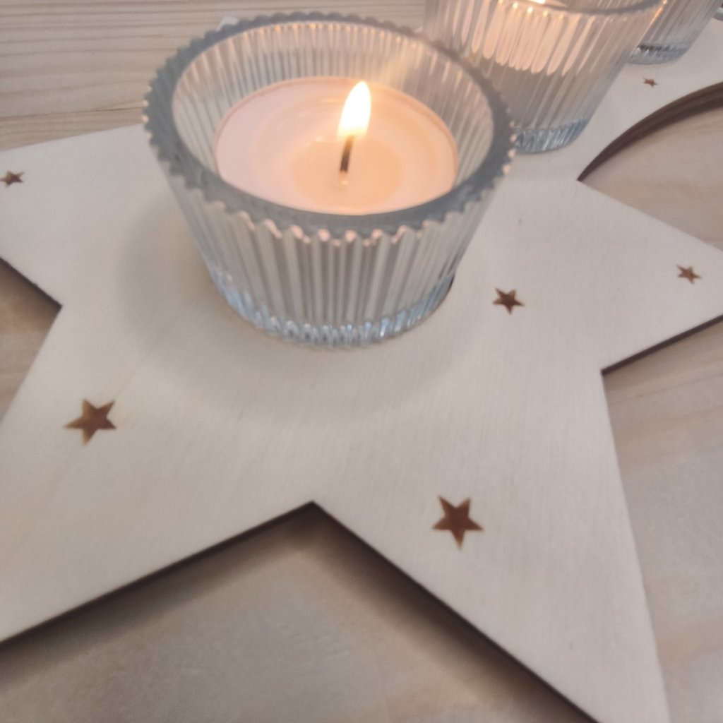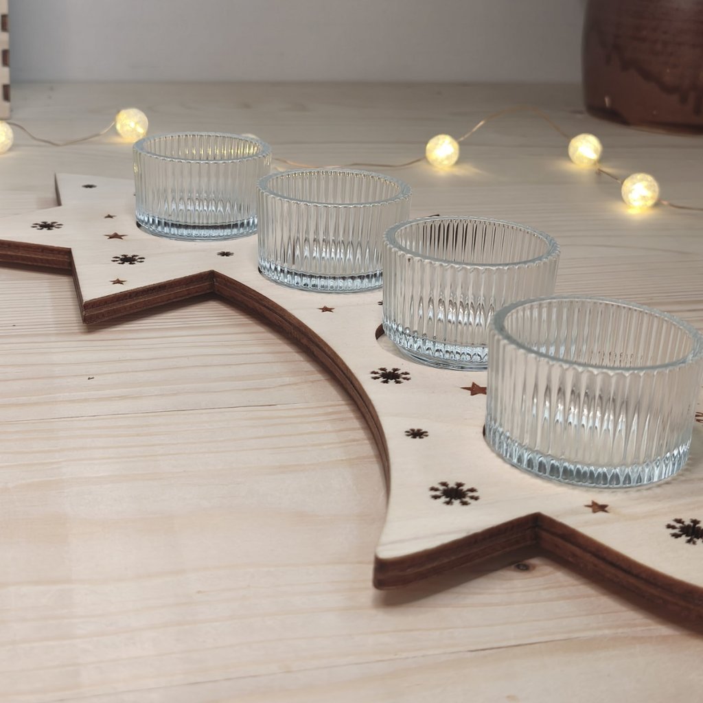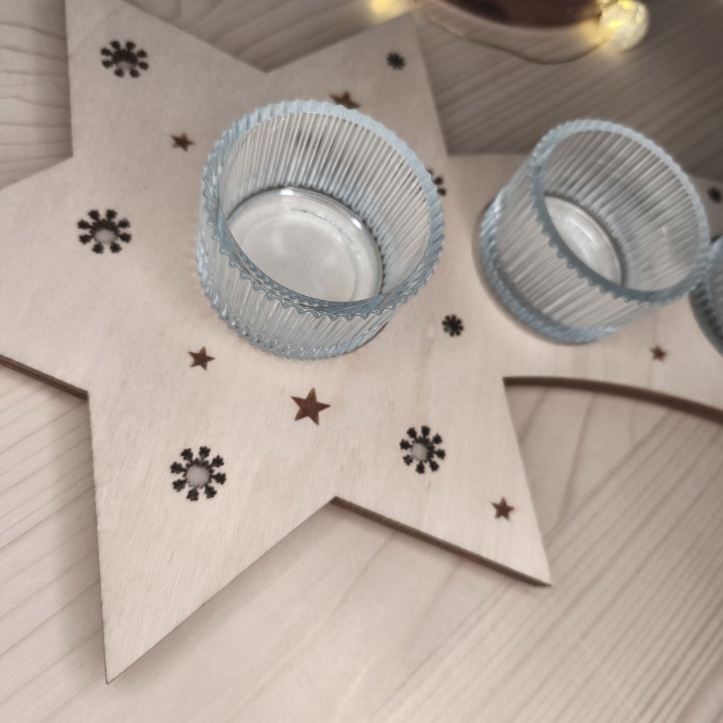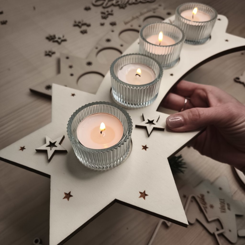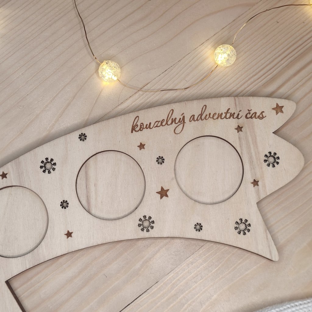 Dřevěný adventní svícen ve tvaru komety je jemná dekorace, která zpříjemní prosincové večery. Je určený na čtyři skleničky pro čajové svíčky – každá z nich symbolizuje jeden adventní týden.