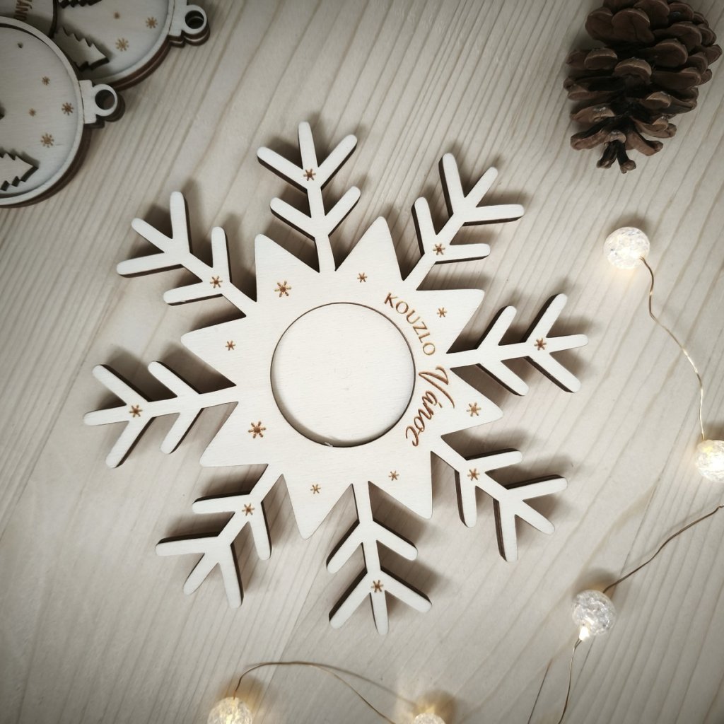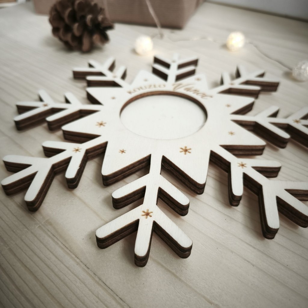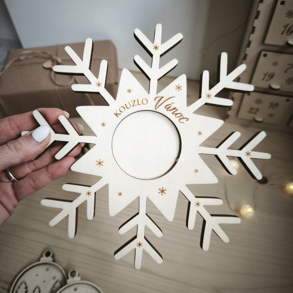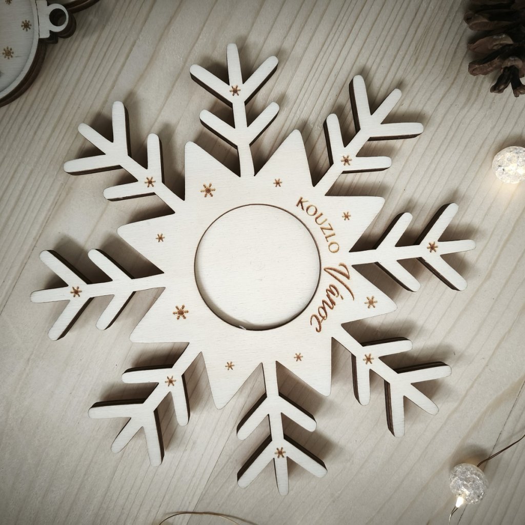 Ve spodní části je nalepené dřevěné kolečko, které vločku lehce nadzvedne. Díky tomu neleží úplně naplocho, ale působí hezky prostorově a elegantně na stole, parapetu nebo komodě.