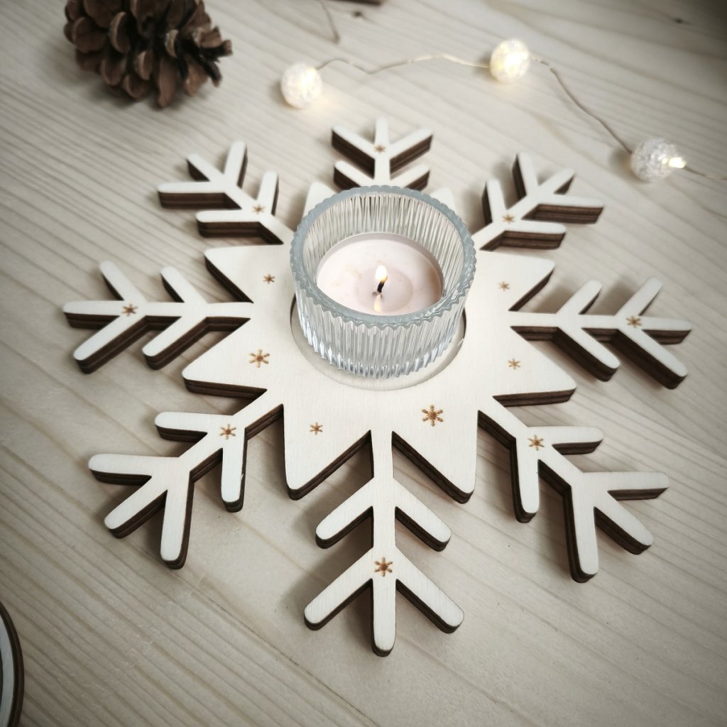 Tento dřevěný svícen ve tvaru vločky je jemná zimní dekorace, která krásně doplní adventní a vánoční atmosféru. Je určený na jednu skleničku pro čajovou svíčku, takže vytvoří malé, příjemné světlo – ideální na večerní zklidnění.