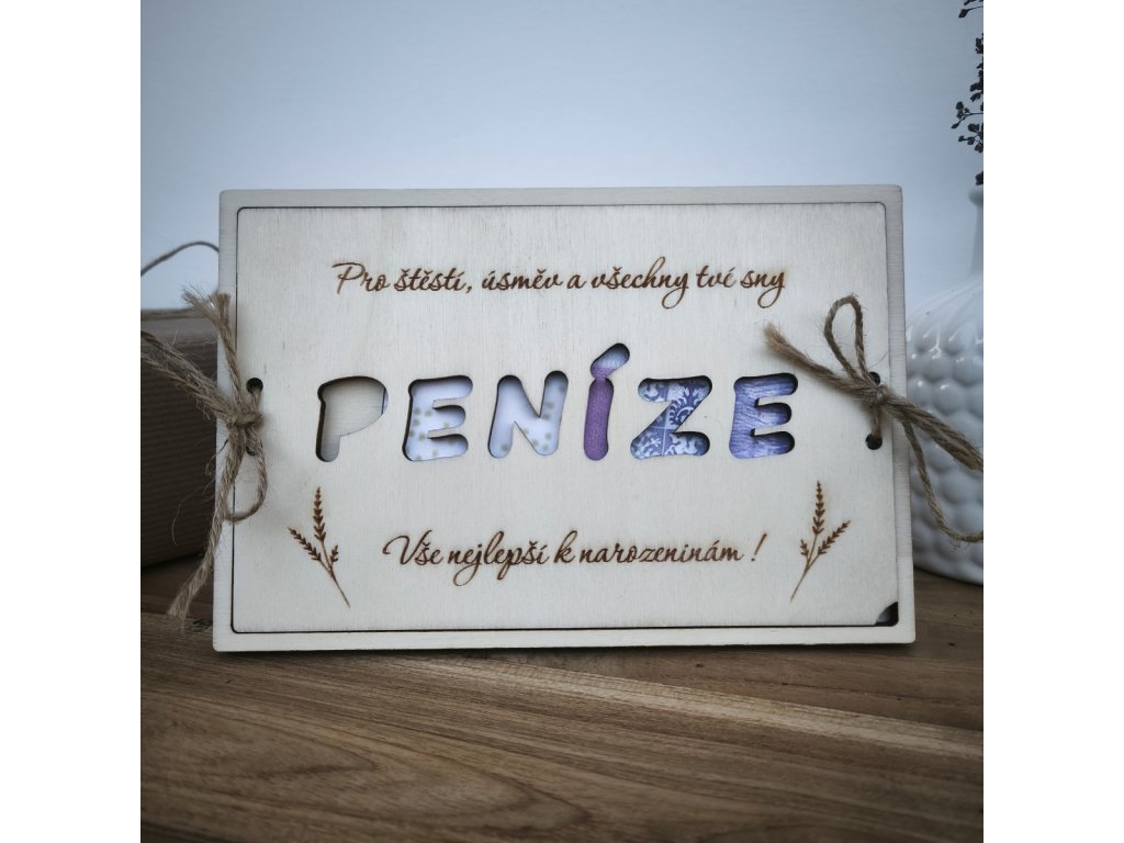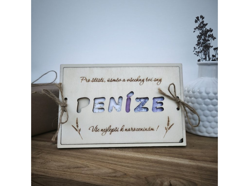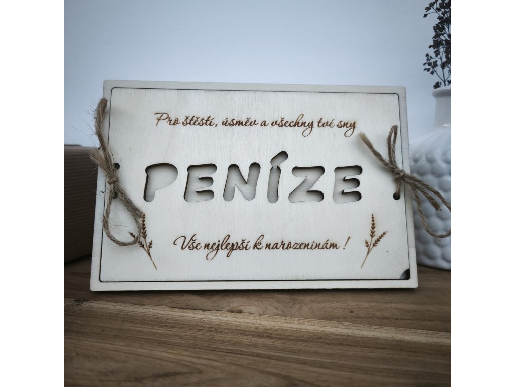 Darujte peníze s nápadem a elegancí. Dřevěné přání je jednoduchý a krásný způsob, jak věnovat peníze k narozeninám - a zároveň nechat něco na památku. Přání s nápisem „PENÍZE“ řekne vše za vás – vtipně a originálně.