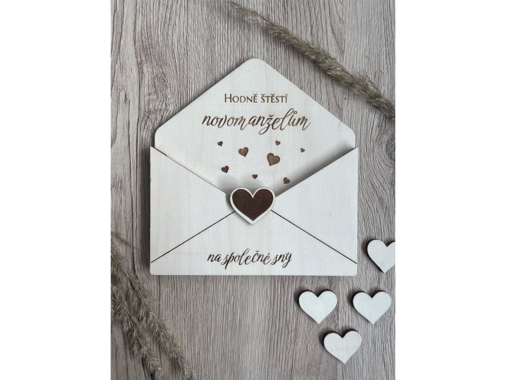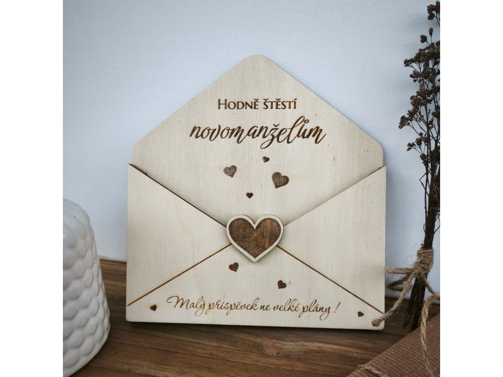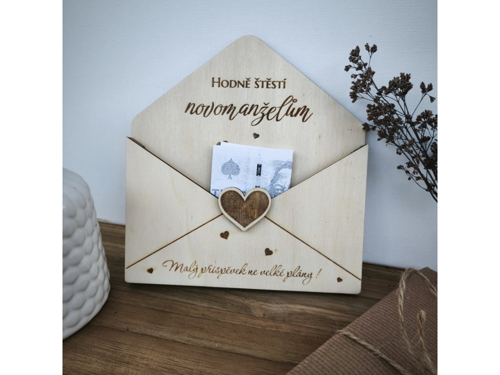 Dřevěná obálka, která vypadá jako opravdová - s pečetí ve tvaru srdce a místem na dar, který je vidět už na první pohled.