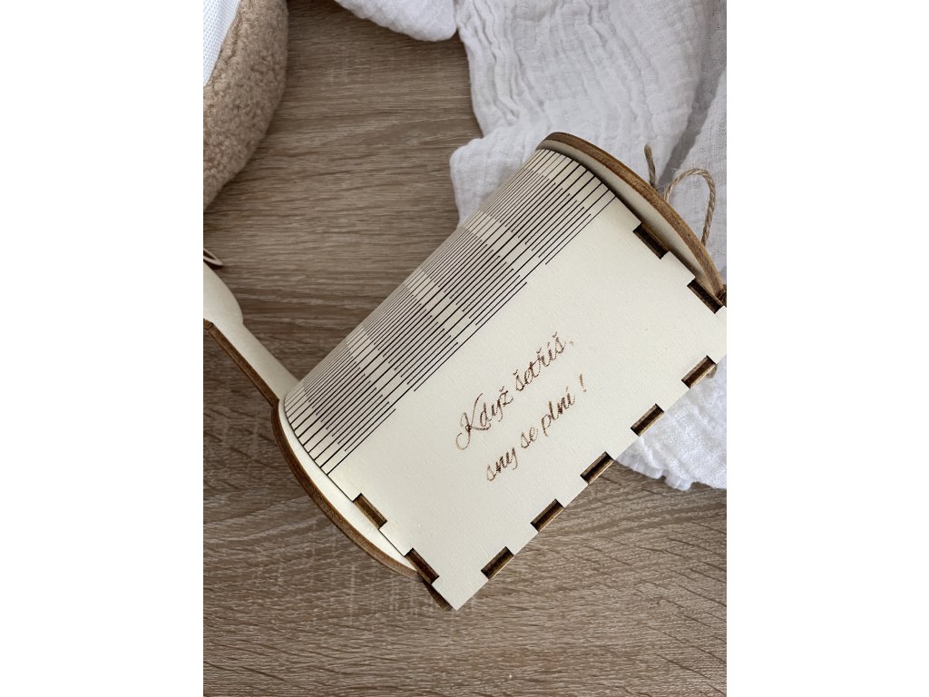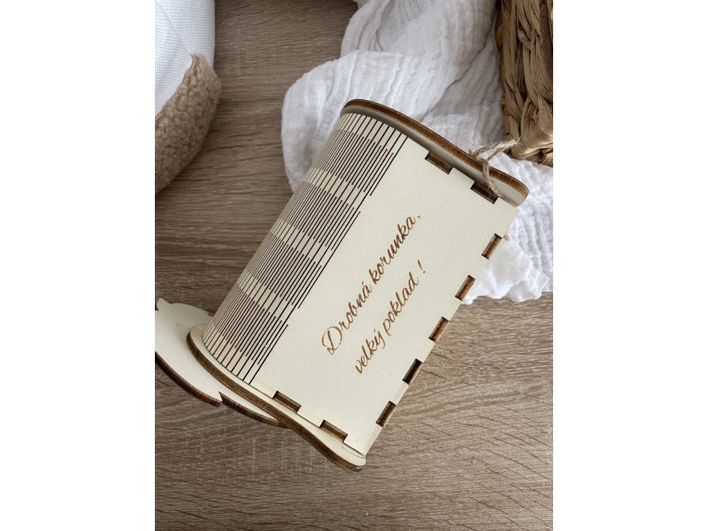 Detailní laserové gravírování z ní dělá nejen funkční, ale i hezký doplněk. Snadno se otevírá pomocí provázků a můžete si ji nechat ozdobit vlastním textem, jménem či věnováním.