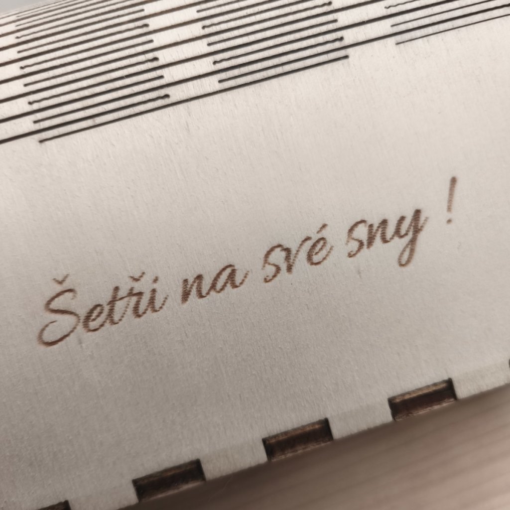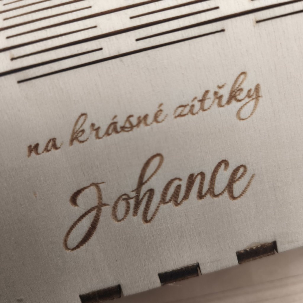 Na pokladničku vám vygravírujeme jméno nebo krátký osobní vzkaz. Právě díky tomu se z ní stává osobní předmět, který má smysl i po letech. Nejen místo pro peníze, ale i drobný kus dřeva s příběhem.