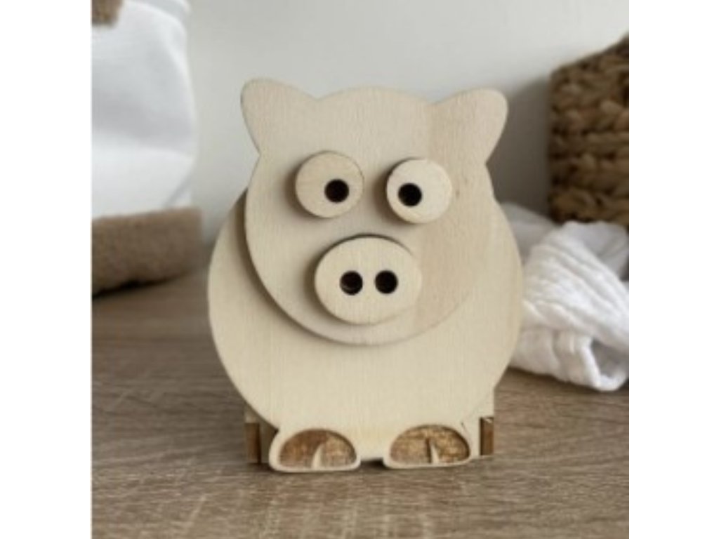 Pokladnička ve tvaru prasátka z dřevěné překližky spojuje veselý vzhled a praktičnost.