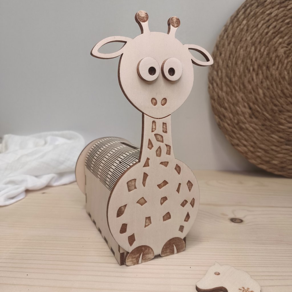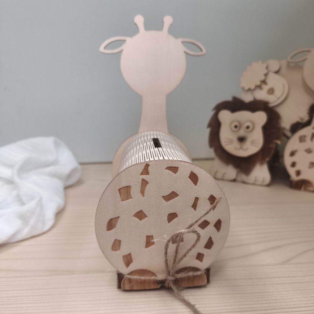 Přední část tvoří motiv žirafy, uprostřed je prostor pro ukládání mincí i bankovek a zadní díl ve tvaru zadečku pokladničku uzavírá.