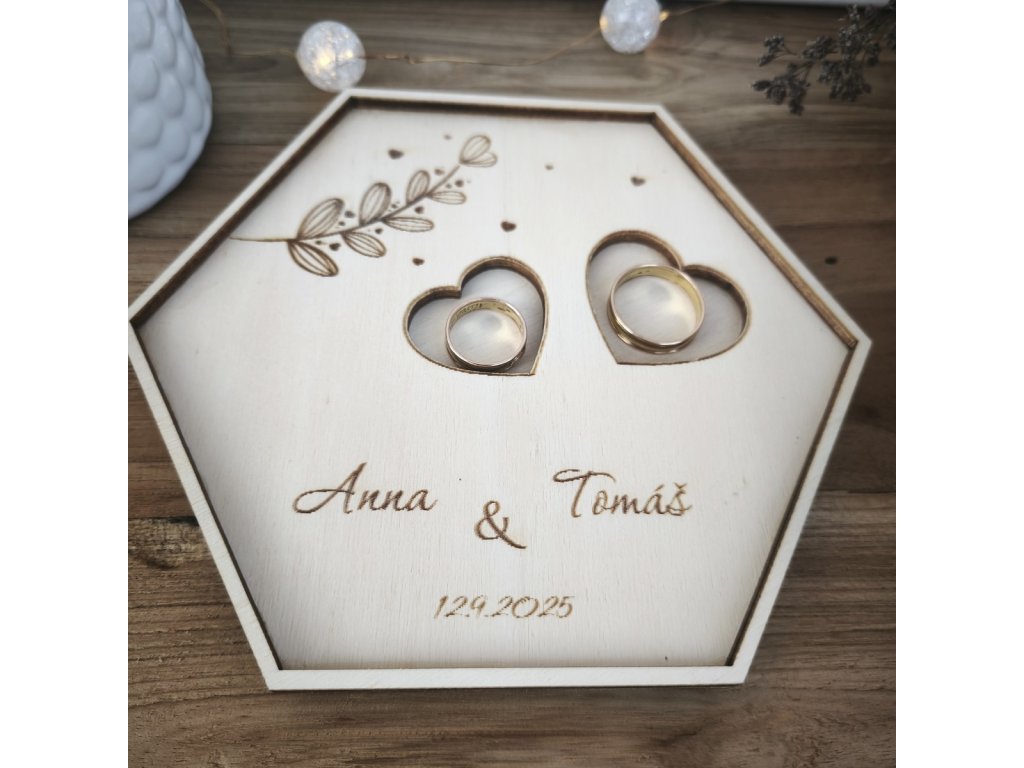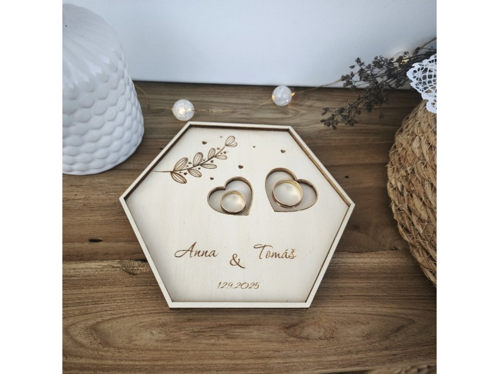 Elegantní tácek na prstýnky ve tvaru šestihranu (hexagon). Jemné gravírování jmen a data svatby dodá obřadu osobní dotek a vytvoří krásnou památku.